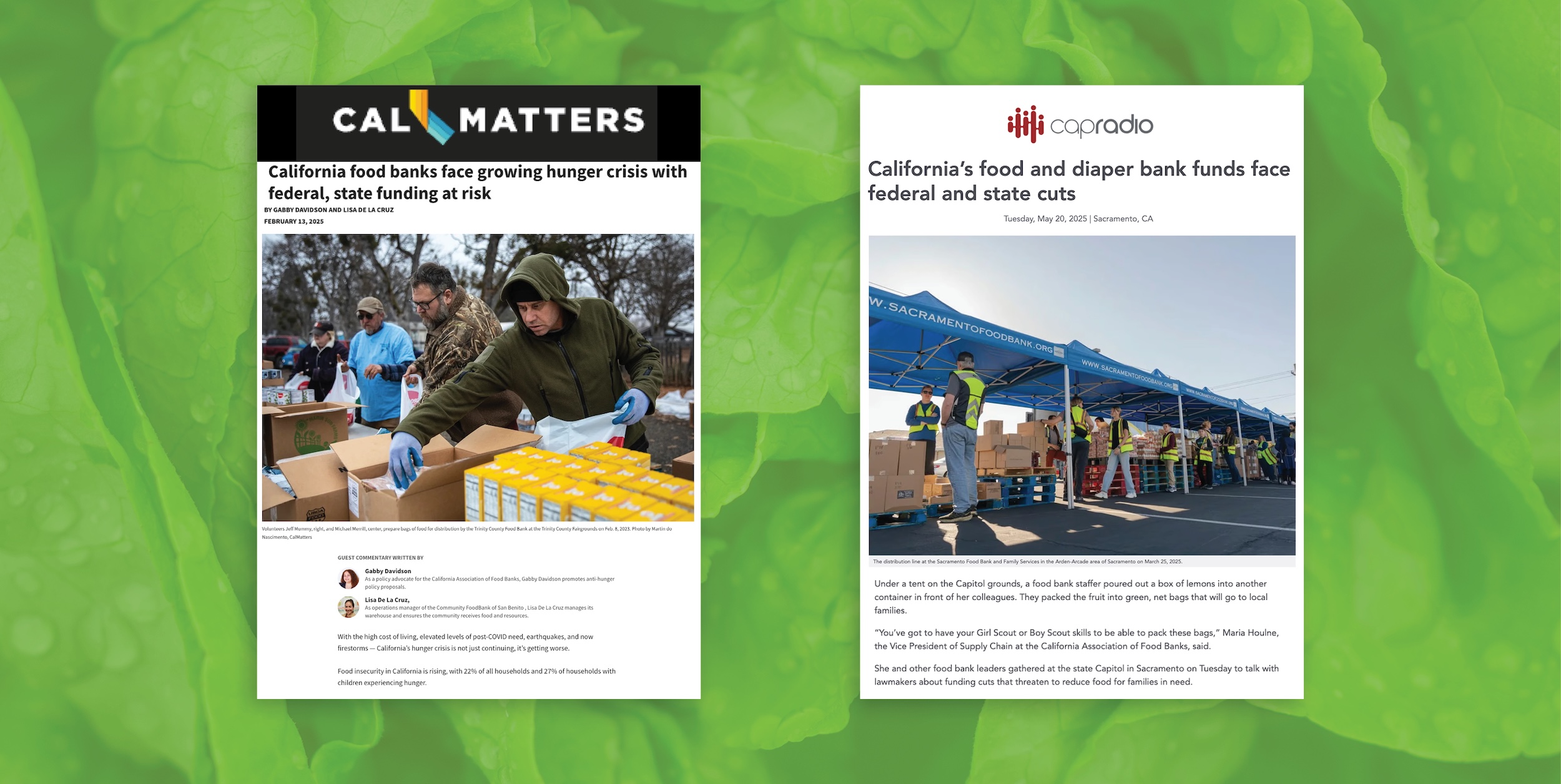 When CalFood, the state program that provides funding for food banks to purchase California-grown and produced food, faced a proposed $52 million cut, the California Association of Food Banks and its 43 members mobilized quickly. Our team supported their advocacy with a focused media strategy that turned statewide data into compelling human stories, highlighting how CalFood supports families experiencing food insecurity while also strengthening farmers, small businesses and local economies. The campaign generated more than 100 earned media placements, doubling our goal, and lawmakers ultimately preserved $60 million in CalFood funding so food banks can continue serving Californians in need.